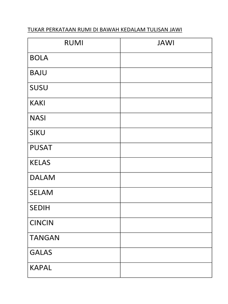 Bahasa InggerisTingkatan 1 2020. Kuiz Jawi Tulisan Rumi Ke Jawi Sumber Pengajaran Latihan Jawi Tahun 4 Worksheet Soalan Jawi Pdf Latihan Menulis Jawi Pdf Latihan 3 Menukar Ayat Jawi Ke Ayat Rumi Worksheet. Sekadar perkongsian daripada saya merupakan guru mata pelajaran sirah 1 hingga 5 dan juga guru yg pernah jadi penanda kertas jawapan sirah.